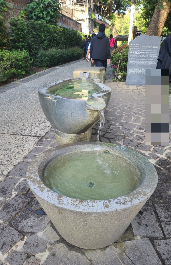 - 지열곡 입구 돌 항아리에 옥색빛 물이 흐르고 있습니다. 대부분의 사람들이 손으로 물 온도도 체크하고, 냄새도 맡는 모습을 볼 수 있었습니다.